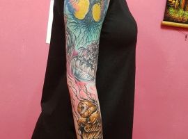 Это комплексное изображение от плеча до запястья, которое создает единую композицию. Оно требует нескольких сеансов и адаптации к анатомии руки для гармоничного вида.