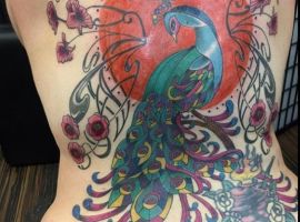Часто татуировку павлин выбирают для того, чтоб сделать перекрытие. Дело в том, что она масштабная и яркая, поэтому закрыть ей получается ранее сделанную у непрофессионального мастера работу в полной мере.