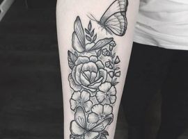Цветы на предплечье. На женском предплечье такая тату всегда будет выглядеть красиво, эффектно, женственно. Это могут быть как цветные, так и эскизы черно белые. По значению все будет зависеть от самого цветка. К примеру, роза – это знак страсти, красоты; роза с шипами может говорить о несчастливой любви и боли об этом. Полевые цветы на теле будут свидетельствовать о наивности, скромности, романтичности девушки. Цветок сакуры набивают оригинальные дамы, которые хотят подчеркнуть свою уникальность и загадочность.