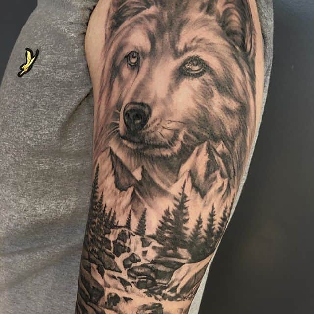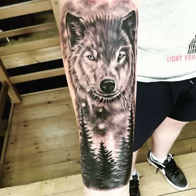 - Тату волк в лесу. Хищник в лесу символизирует поиски жизненного смысла, что означает для окружающих силу духа и постоянную работу над собой.