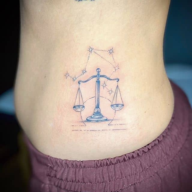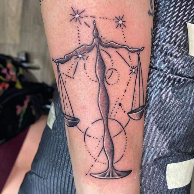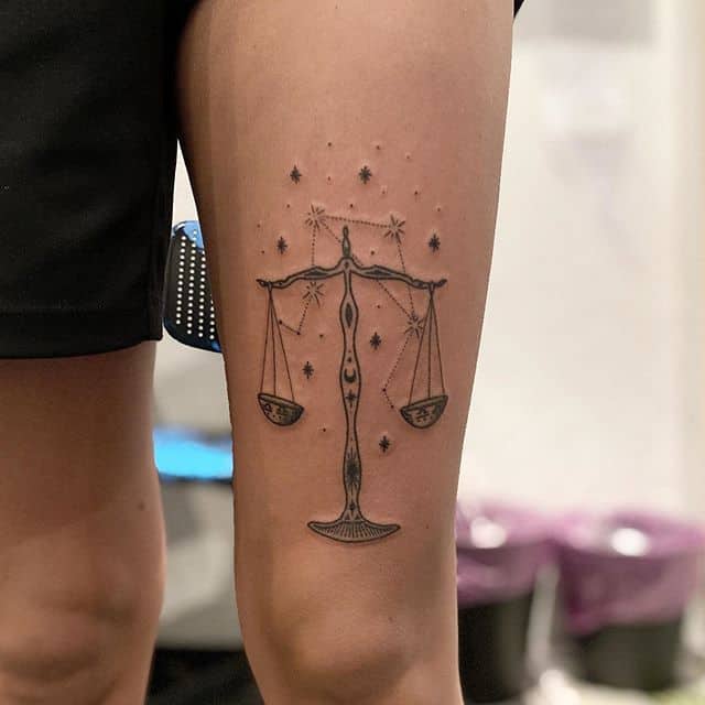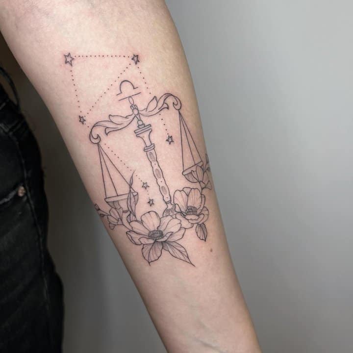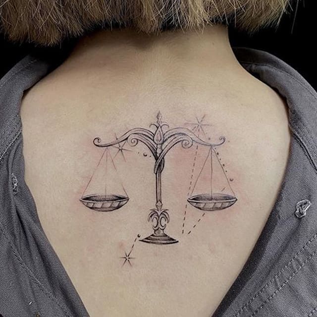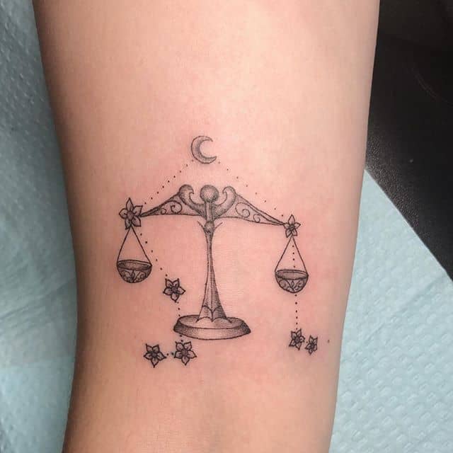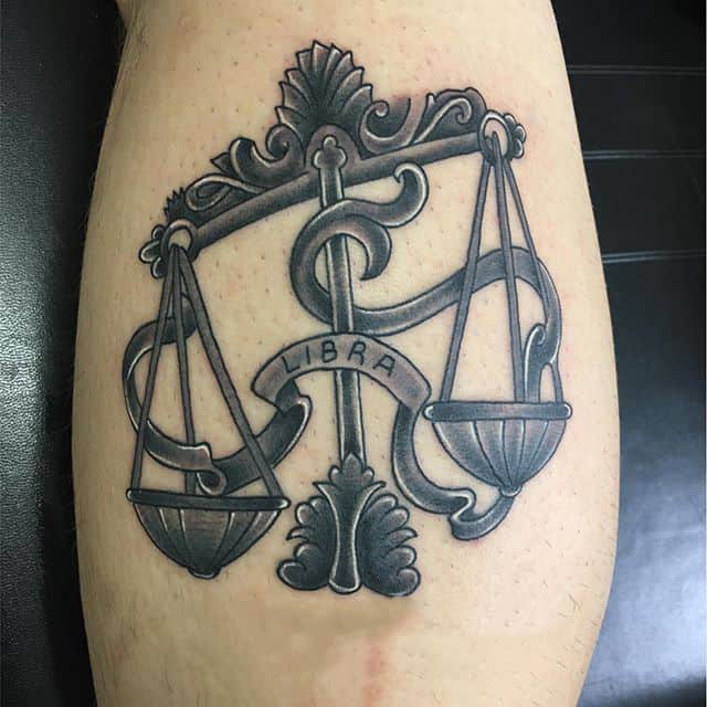 На объемных работах весы изображаются в руках у какого-либо божества (Фемиды, Осириса), или исторической личности. В образе весов тату созвездий часто дополняют красивые надписи на латыни, собственная дата рождения, геометрические узоры.