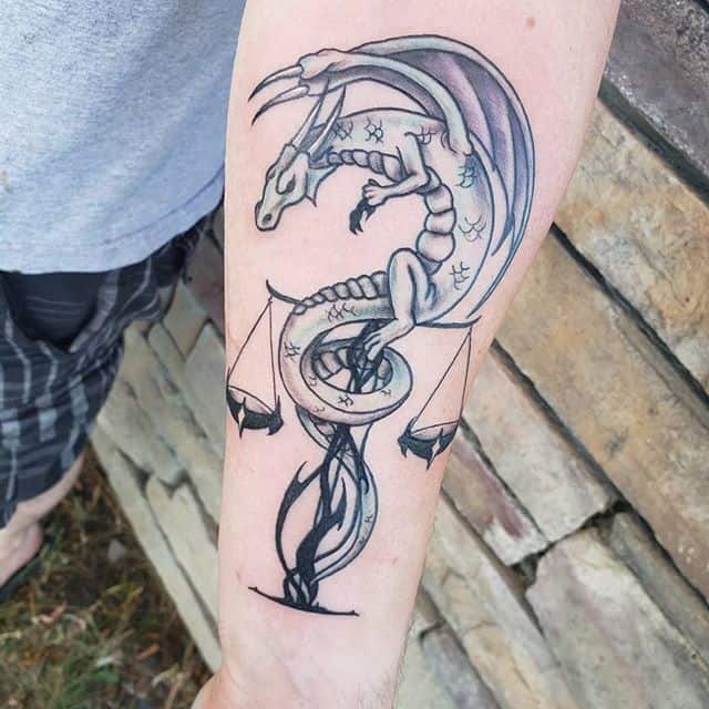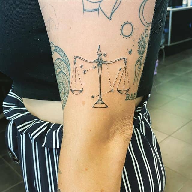 Созвездие Весов схоже со Скорпионом, поэтому он нередко присутствует на изображении. Популярен эскиз, на котором скорпион держит предмет на хвосте, из-за чего может показаться, что в одну из чаш капает яд.
