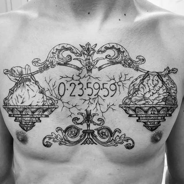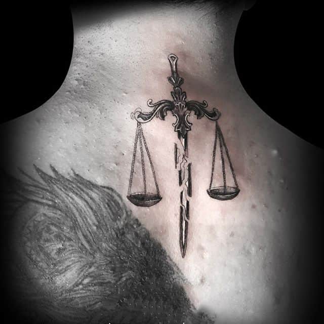 Тату весов для мужчин является способом выразить свою храбрость и твердость. Эскизы таких изображений преимущественно яркие и крупные, содержат много дополнительных деталей и мелких элементов. В масштабных тату весов эскиз дополняется легендарными божествами. Ножами, молниями и проволокой выражается мужественность хозяина рисунка.