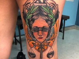 Первое, это конечно же тату весы. Это символ справедливости. Именно с их помощью богиня измеряла вес плохих и хороших поступков человека. И если плохое перевешивало, то этими же весами она мерила и тяжесть наказания преступника.