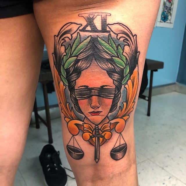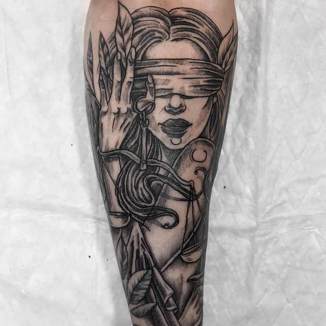 Первое, это конечно же тату весы. Это символ справедливости. Именно с их помощью богиня измеряла вес плохих и хороших поступков человека. И если плохое перевешивало, то этими же весами она мерила и тяжесть наказания преступника.