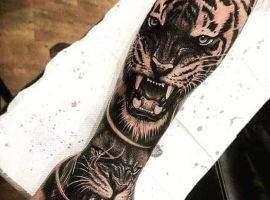 Часто выбирают эскиз тигрица с тигрятами. Этот рисунок – образ материнства, любви к своим детям, заботе о них и готовности защитить их любой ценой. Значение тату тигр с тигренком будет идентичным. Это оригинальная идея для рукава.