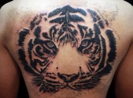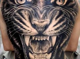Тату голова тигра в спокойном и без эмоциональном настроении говорит о спокойствии, стремлении к реализации, силе, уверенности своего обладателя. Смелые мужчины могут решится набить рисунок на всю спину. Чаще всего выбирают стиль реализм, треш полька, графика.