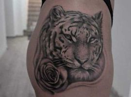 Хищник и цветы выглядит очень нежно и женственно. Девушка может выбрать композицию с любым цветком – розы, пионы, сакура, лотос, подсолнух. Значение татуировки тигр будет красота, женская сила, величественность, тяга к прекрасному вокруг. Интересно смотрится тату тигр на бедре.