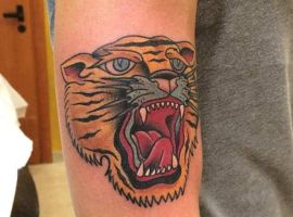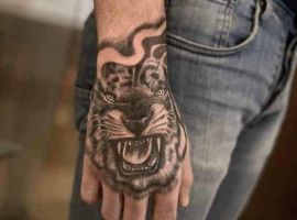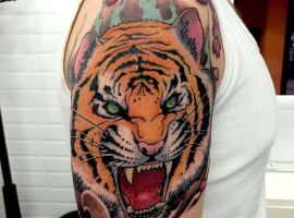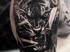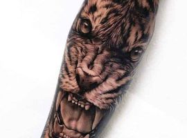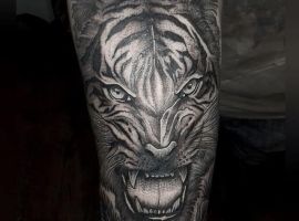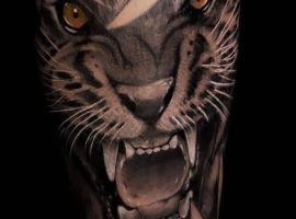 Тигр с оскалом очень распространены у мужчин. Такими рисунками они пытаются рассказать об уверенности в себе и готовности сражаться за свои интересы. Также выполняют часто в реализме, цветном или черно-белом. Интересно смотрится тату оскал тигра на плече, предплечье, бедре, тату на спине или на грудь. Тату оскал тигр фото легко можно найти в интернете, а также интересные эскизы с ним. К примеру ревущий хищник с черепом на голове говорит о некой опасности со стороны обладателя рисунка. В сочетании с лапой животного и острыми когтями на ней, оскал может символизировать злость мужчины, способность разрушать препятствия с особой жестокостью и агрессией. Лапа хищника без когтей символизирует яростное желание мужчины добиться успеха, заполучить желаемые им блага.
