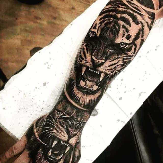 Часто выбирают эскиз тигрица с тигрятами. Этот рисунок – образ материнства, любви к своим детям, заботе о них и готовности защитить их любой ценой. Значение тату тигр с тигренком будет идентичным. Это оригинальная идея для рукава.