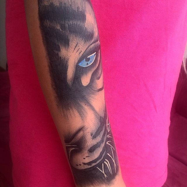 Половину морды чаще набивают те парни, которые нашли сходство с собой в характере и образе животного. Встречается комбинация с половиной головы человека, черта, волка, самурая, джокера и других. Такие рисунки говорят о сочетании в одном человеке двух или более сторон, добра и зла, темного и светлого. Удачным местом будет предплечье.