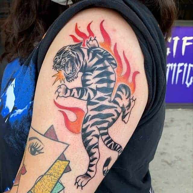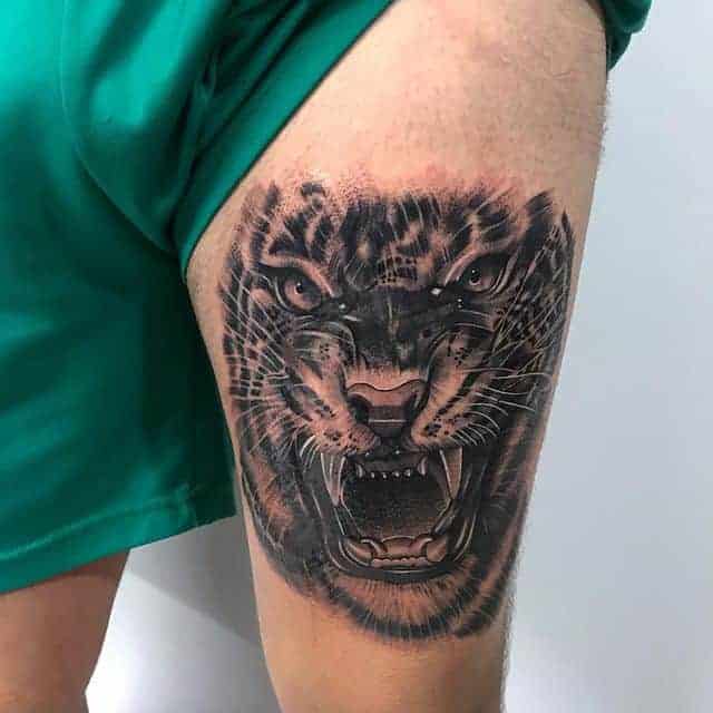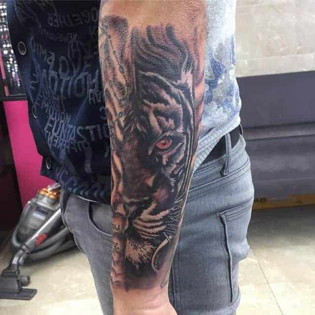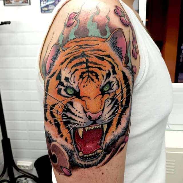 Тигр с оскалом очень распространены у мужчин. Такими рисунками они пытаются рассказать об уверенности в себе и готовности сражаться за свои интересы. Также выполняют часто в реализме, цветном или черно-белом. Интересно смотрится тату оскал тигра на плече, предплечье, бедре, тату на спине или на грудь. Тату оскал тигр фото легко можно найти в интернете, а также интересные эскизы с ним. К примеру ревущий хищник с черепом на голове говорит о некой опасности со стороны обладателя рисунка. В сочетании с лапой животного и острыми когтями на ней, оскал может символизировать злость мужчины, способность разрушать препятствия с особой жестокостью и агрессией. Лапа хищника без когтей символизирует яростное желание мужчины добиться успеха, заполучить желаемые им блага.
