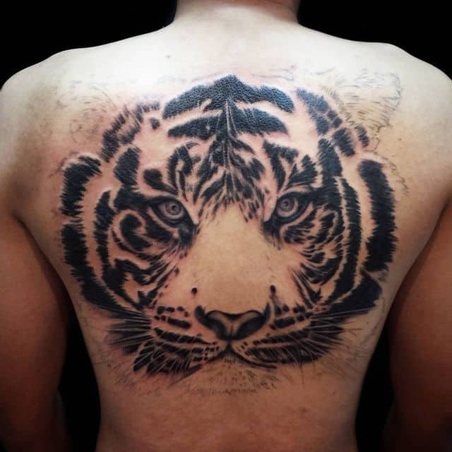 Тату голова тигра в спокойном и без эмоциональном настроении говорит о спокойствии, стремлении к реализации, силе, уверенности своего обладателя. Смелые мужчины могут решится набить рисунок на всю спину. Чаще всего выбирают стиль реализм, треш полька, графика.