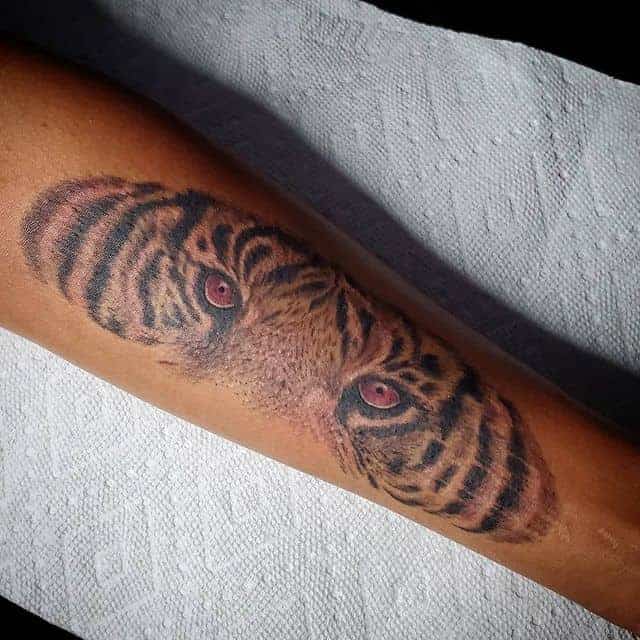Тату глаза тигра могут говорить о проницательности, наблюдательности, внимательности к деталям, желании контролировать какую-то ситуацию по максимуму. Популярные цвета для глаз синий, зеленый, желтый, белый. Красный цвет будет сигналом о ярости и гневе обладателя картинки на теле. В большинстве случаев делают тату на руке.