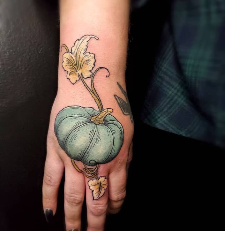 В культуре разных народов тыква присутствовала и как символ, и как атрибут обрядов и гаданий. Например, в Украине, если к девушке сватался неугодный ей жених, она имела право ему отказать – преподнеся тыкву. Символически это означало, что парень слишком прост для невесты, как самый простой и обыденный овощ. В качестве татуировки этот образ можно трактовать так, что человек легко может отказаться от всего, что кажется ему в жизни недостойным его уровня.