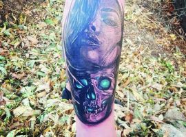 Ще один складний 3D напрямок, але надзвичайно затребуваний, при якому створюється враження, що під розірваною шкірою всередині тіла не скелет, а Механіка кіборга – металеві деталі, Болти, шестерінки. Прийнято робити біомеханічне тату на спині, на гомілці або плечі.