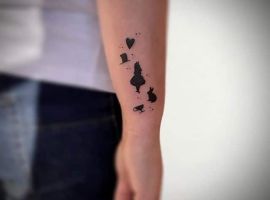 Татуювання за мотивами «Аліса в країні чудес» зображуються саме у вигляді популярних героїв казки. При цьому, найчастіше це не головна героїня Аліса, а Чеширський кіт. Цей чарівний персонаж просто полонив шанувальників твору, він харизматичний, оптимістичний, спокійний і загадковий. А головне – він унікальний, чим і привернув до себе таку величезну кількість фанатів по всьому світу. Звичайно, вибирають котика особистості творчі і дотепні, з хорошим почуттям гумору і впевненістю в собі. Цього героя малюють на шкірі в тому вигляді, в якому всі ми пам’ятаємо його в кіно і мультфільмах.
