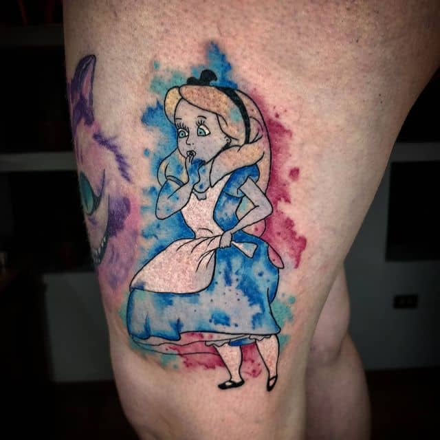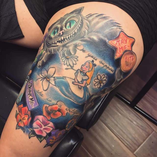 Татуювання за мотивами «Аліса в країні чудес» зображуються саме у вигляді популярних героїв казки. При цьому, найчастіше це не головна героїня Аліса, а Чеширський кіт. Цей чарівний персонаж просто полонив шанувальників твору, він харизматичний, оптимістичний, спокійний і загадковий. А головне – він унікальний, чим і привернув до себе таку величезну кількість фанатів по всьому світу. Звичайно, вибирають котика особистості творчі і дотепні, з хорошим почуттям гумору і впевненістю в собі. Цього героя малюють на шкірі в тому вигляді, в якому всі ми пам’ятаємо його в кіно і мультфільмах.