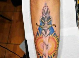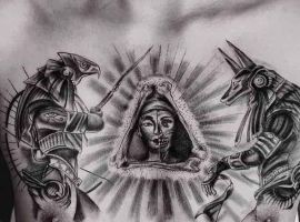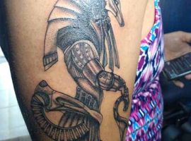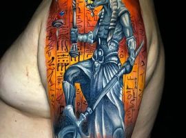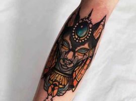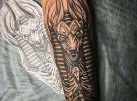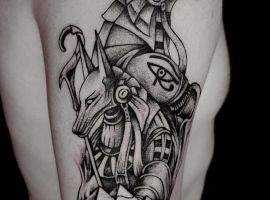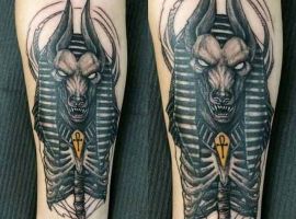 Єгипетська тема приваблює людей з усього світу своєю таємничістю і небезпекою. Єгипет – це стародавня цивілізації, в якій є багато нерозгаданих секретів. У тату Єгипетська символіка використовується досить активно, символи Стародавнього Єгипту швидко набули особливої популярності: око Бога, хрест Анкх (анх), скарабей, піраміда і тп. Багато татуюваннь зображують богів. Одне з найбільш неоднозначних і помітних – Анубіс татуювання.