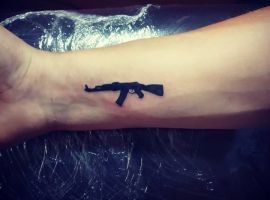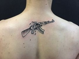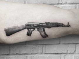 Тату автомата Калашникова на тілі – вираз сміливості, мужності для хлопців. Людина, яка зробила таке татуювання, посилає в світ сигнал про те, що вона не витрачає час на сентименти, що діє блискавично. Також таке тату означає першорядну важливість результату. Зазвичай наносять татуювання зі зброєю чоловіки на спину, на руку.