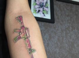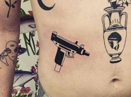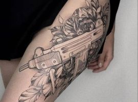 Як видно на фото тату зі зброєю є і для дівчат. Зазвичай жінки вибирають вид таких татуювань для того, щоб висловити свій амбітний характер, войовничий дух. Ці дами руйнують стереотипи, що жіноча стать створена тільки для родини і народження дітей. Їм важливіше інше, вони вибирають для себе іншу роль. Ескіз тату автомата на жіночому тілі свідчить про те, що дівчина готова за себе постояти, що вона може поставити кривдника на місце. І мова йде не тільки про фізичний захист, а й про емоційний. Крім того, оригінальні тату пістолет говорять про те, що пані любить ризик і азарт. Зазвичай вибирають для нанесення зону шиї, зап’ястя, зворотну сторону руки, стегно, на спині.