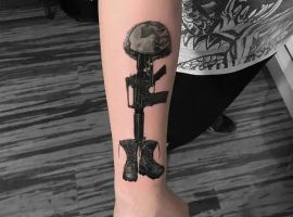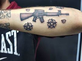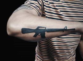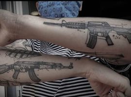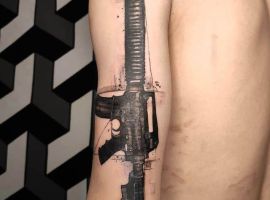 АК47 і М16 на руці в стилі реалізм або ньюскул – сьогодні це дуже популярна ідея як для чоловіка, так і жінки. Особливостями «старого стилю» можна назвати схематичне зображення, відсутність реалістичних переходів, що видно на фото тату.