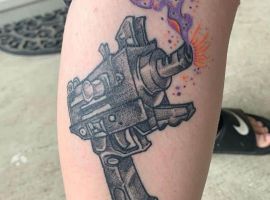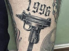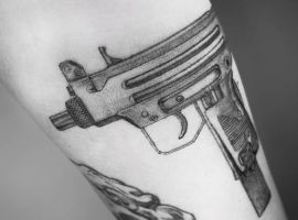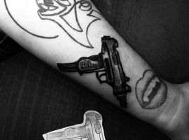 У 90% випадків татуювання зі зброєю виконують в чорно-білому кольорі. Мабуть, то пов’язано з тим, що тема зброї – це не розвага і не жарти, тому і підкреслюється вся серйозність татуювання темними відтінками. Жанр реалізм дозволяє передати всі деталі композиції.