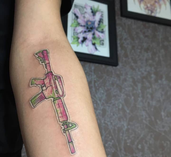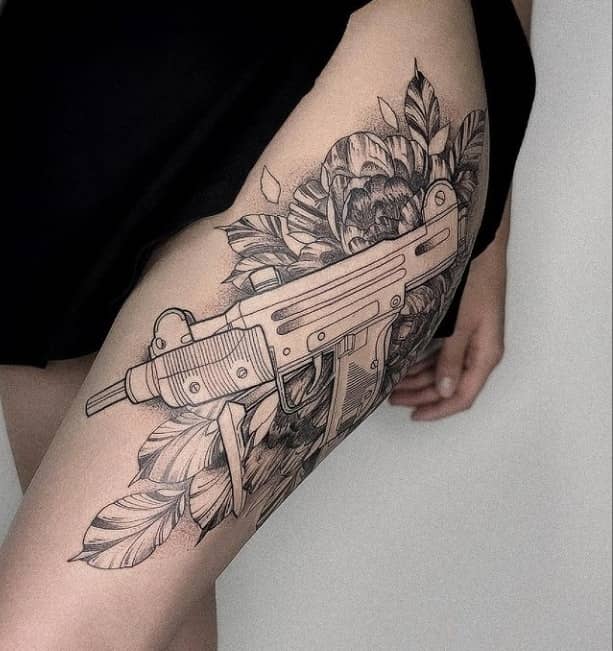 Як видно на фото тату зі зброєю є і для дівчат. Зазвичай жінки вибирають вид таких татуювань для того, щоб висловити свій амбітний характер, войовничий дух. Ці дами руйнують стереотипи, що жіноча стать створена тільки для родини і народження дітей. Їм важливіше інше, вони вибирають для себе іншу роль. Ескіз тату автомата на жіночому тілі свідчить про те, що дівчина готова за себе постояти, що вона може поставити кривдника на місце. І мова йде не тільки про фізичний захист, а й про емоційний. Крім того, оригінальні тату пістолет говорять про те, що пані любить ризик і азарт. Зазвичай вибирають для нанесення зону шиї, зап’ястя, зворотну сторону руки, стегно, на спині.