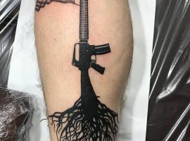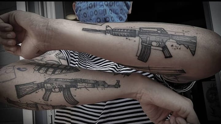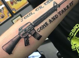АК47 і М16 на руці в стилі реалізм або ньюскул – сьогодні це дуже популярна ідея як для чоловіка, так і жінки. Особливостями «старого стилю» можна назвати схематичне зображення, відсутність реалістичних переходів, що видно на фото тату.