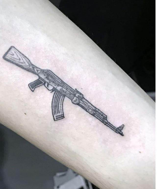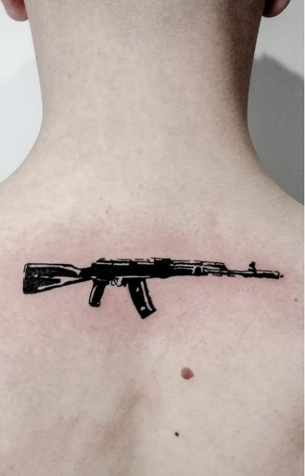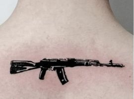 Тату автомата Калашникова на тілі – вираз сміливості, мужності для хлопців. Людина, яка зробила таке татуювання, посилає в світ сигнал про те, що вона не витрачає час на сентименти, що діє блискавично. Також таке тату означає першорядну важливість результату. Зазвичай наносять татуювання зі зброєю чоловіки на спину, на руку.