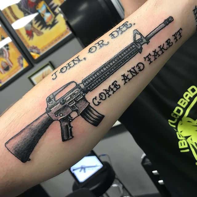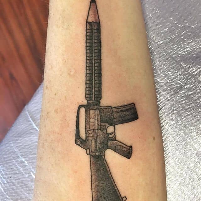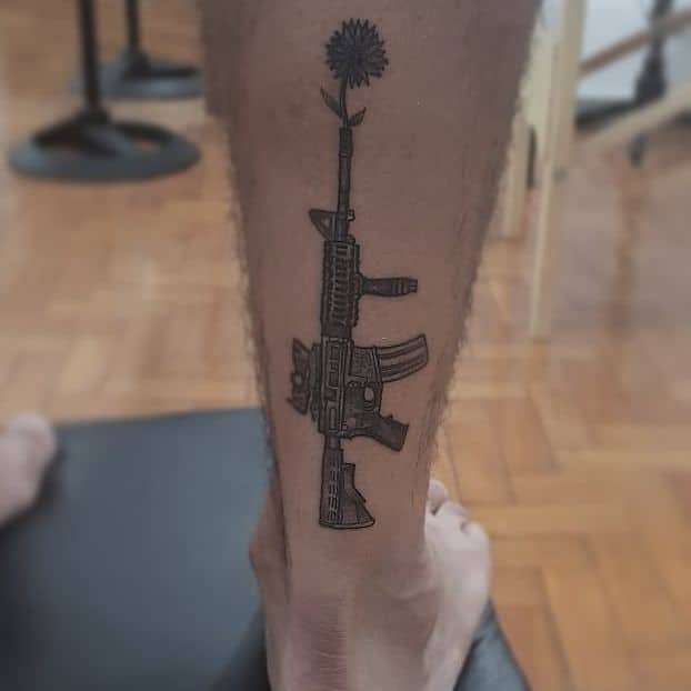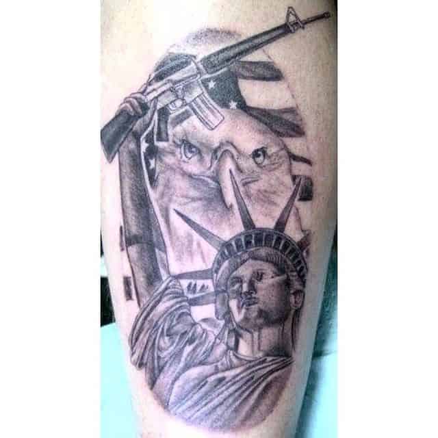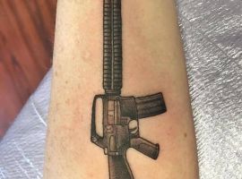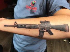 Часто тату автомат АК47 і M16 або інші моделі “місцевого” автоматичної зброї є проявом патріотизму. Це люди, які люблять свою країну і в разі настання військових дій готові встати на її захист! Але це не просто тату «для солдата». Сенс татуювання глибше – вона демонструє високу моральність і наявність почуття справедливості. Також АК-47 і M-16 набивають геймери – фанати Counter-Strike і інших ігор подібного жанру.