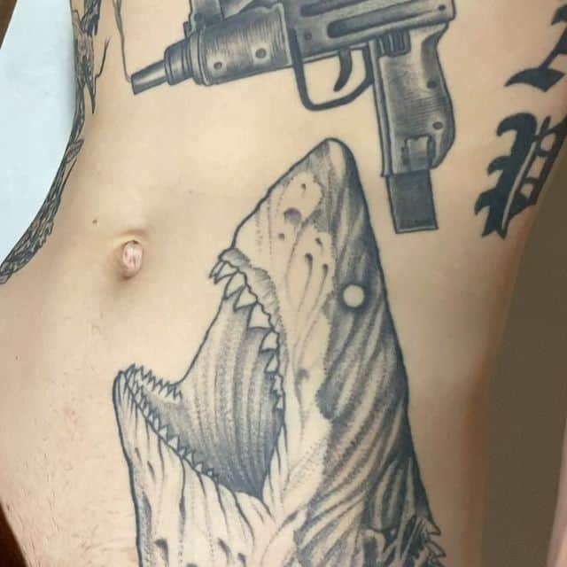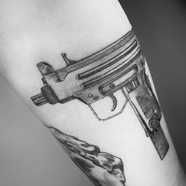 У 90% випадків татуювання зі зброєю виконують в чорно-білому кольорі. Мабуть, то пов’язано з тим, що тема зброї – це не розвага і не жарти, тому і підкреслюється вся серйозність татуювання темними відтінками. Жанр реалізм дозволяє передати всі деталі композиції.