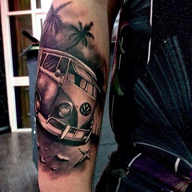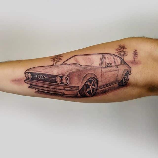 Татуювання у вигляді автомобіля можна зробити в будь-якому стилі, навіть в найпростішому контурному варіанті. Однак найчастіше роблять реалістичні малюнки і наносять їх на передпліччя. Адже гармонійно виглядає довгаста форма машини на довгастій частині тіла.