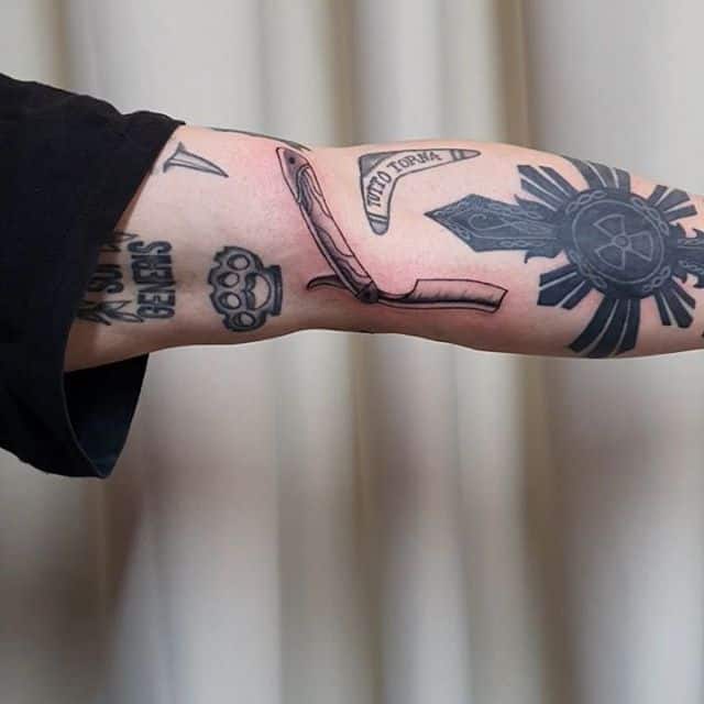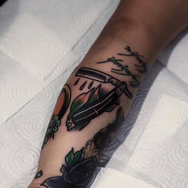 Переважні стилі: графіка, реалізм, нью скул. Зазвичай татуювання з бритвою роблять на руках (плече, зап’ястя, передпліччя).