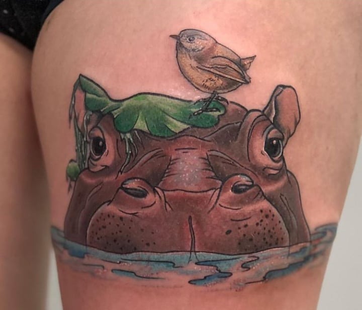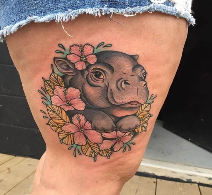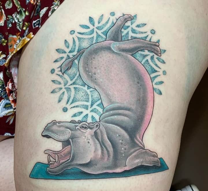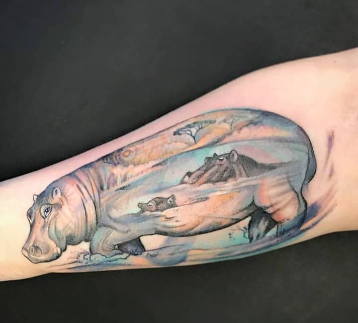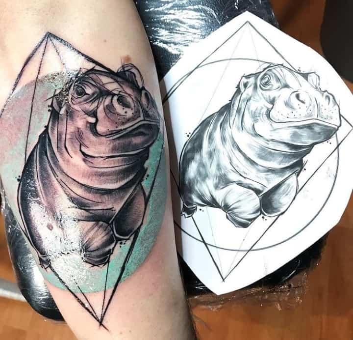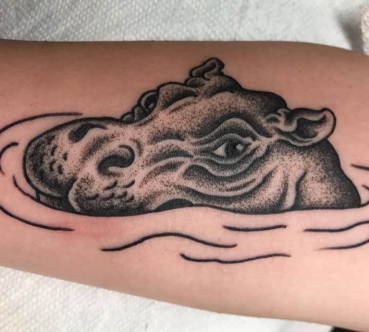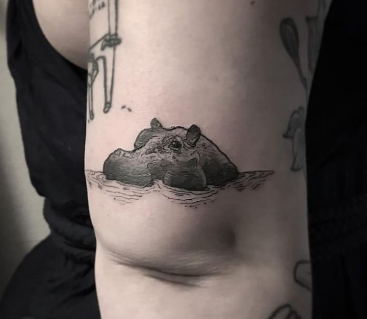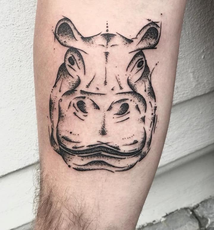 Бегемот – тварина не особливо естетична і складно уявити, що вона уособлює як символ. Однак, у багатьох культурах світу з давніх-давен до бегемота було особливе ставлення. Наприклад, в Стародавньому Єгипті, де різним богам часто приписували вид тварин і птахів, у вигляді гіпопотаму представляли богиню материнства. Відомо, що самки цієї тварини дуже хороші матері і завжди захищають своїх дитинчат до останнього. Так і в якості татуювання, образ бегемота підійде жінці, яка є люблячою матір’ю і вважає дітей – головним у своєму житті.