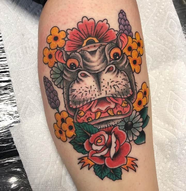 Значення татуювання бегемот має давню історію, у багатьох африканських племен його шанували священною твариною. Люди приписували бегемоту неабияку сміливість. До того ж, через те, що мешкає цей звір переважно у воді, його довгий час вважали прообразом медицини, символом здоров’я. З іншого боку, в Стародавньому Римі, Гіпопотами брали участь в боях, подібно гладіаторам.