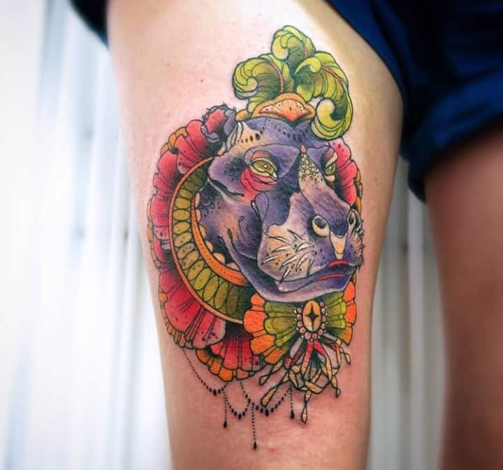 Татуювання з різними тваринами – найпопулярніша ідея. Найчастіше вибирають тигра і лева або ведмедя і вовка. Однак, багато хто не хоче повторюватися, а хочуть знайти більш оригінальну ідею. Дуже цікаве і нестандартне значення татуювання бегемот.