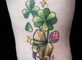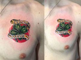 - Тату з конюшиною. Такий варіант здавна вважався щасливим. Конюшина приносить матеріальне благополуччя і достаток в будинок, допомагає домогтися поставлених цілей. Конюшина з чотирма листочками користується особливою популярністю, дозволяє домогтися взаємної любові.