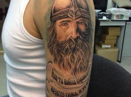 Напис. Доповнюючи татуювання богатиря написом, часто вибирають гасло давньоруських воїнів «Не в силі Бог, а в правді», «Хто до нас з мечем прийде, той від меча і загине»