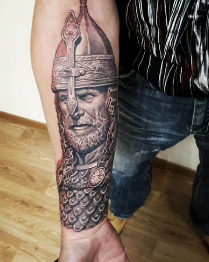 Тату богатир – портретна робота. Вибираючи частину тіла для зображення, потрібно враховувати, що це має бути достатній простір, щоб малюнок передавав всю міць і силу богатирського духу. Для виконання такого татуювання підійдуть: