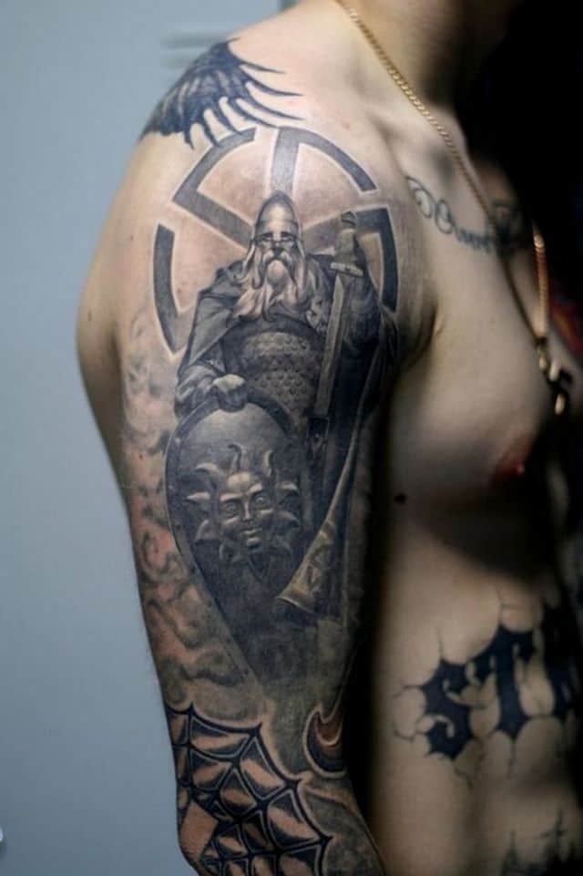 Щит. Відзнака благородного воїна. Не тільки засіб захисту в бою, але і місце для розміщення особистої символіки. Саме на щиті зображується фамільний герб і девіз. Доповнюючи татуювання богатиря щитом, його простір використовують для знаків і для написів.