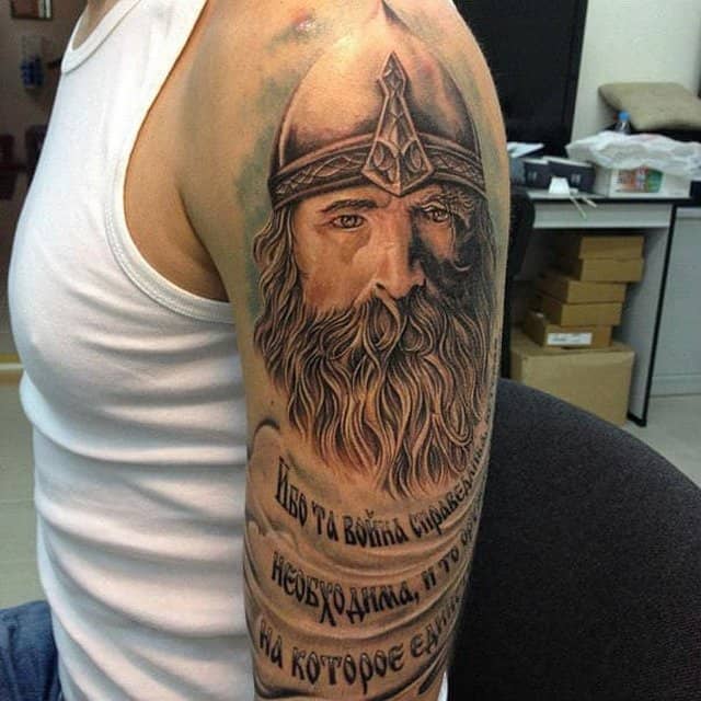 Напис. Доповнюючи татуювання богатиря написом, часто вибирають гасло давньоруських воїнів «Не в силі Бог, а в правді», «Хто до нас з мечем прийде, той від меча і загине»