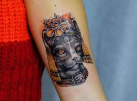Бастет. Богиня Бастет – покровителька домашнього затишку, жіночої краси і любові. Єгиптяни зображували дівчину з головою кішки. Але, в найдавніші часи вона носила лик левиці, а не домашньої тварини. Тату богині символізує жіночу Величність, граціозність або просто любов до кішок.