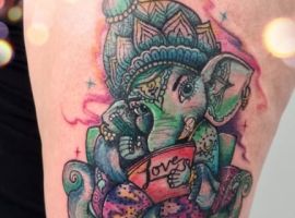 Ганеша – індуїстський бог багатства, достатку, процвітання. У вигляді тату стає талісманом, сприяє діловому і творчого успіху, допомагає приймати правильні рішення, забезпечує фінансову стабільність.