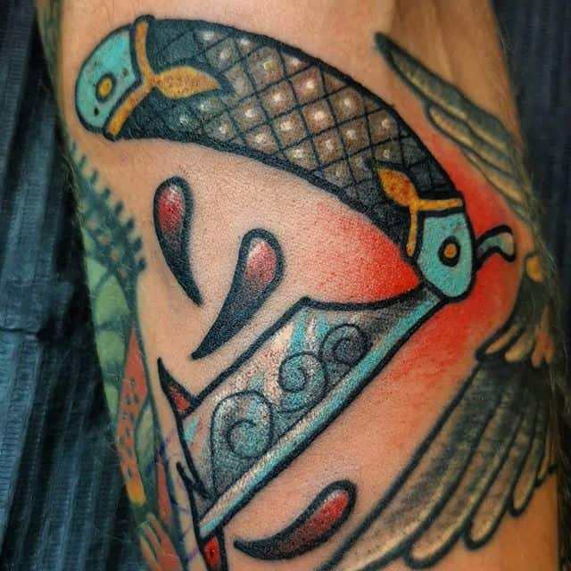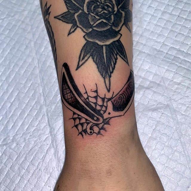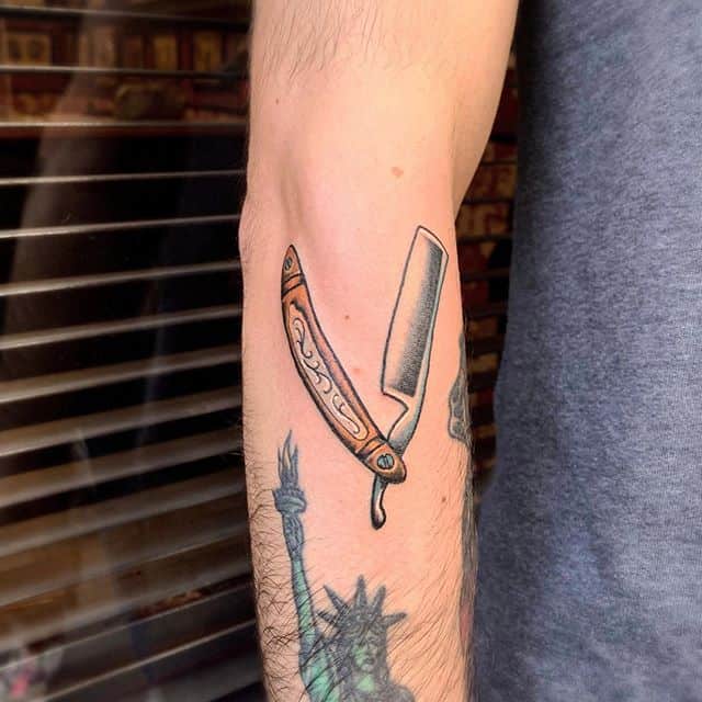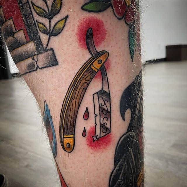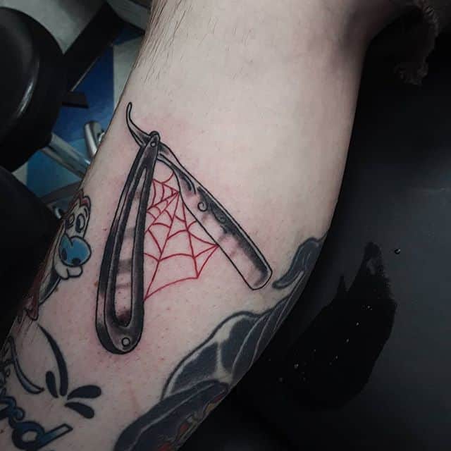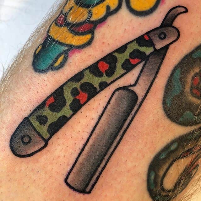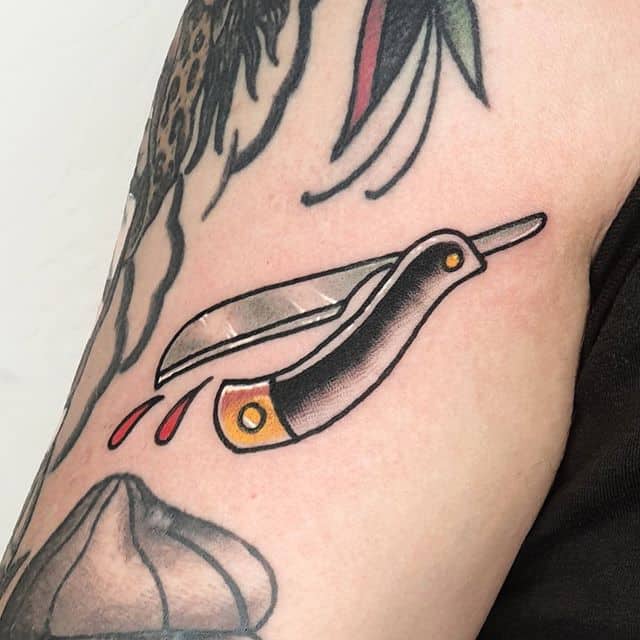 Коли складну бритву зображують напіврозкритою, то господар тату завжди готовий до неприємностей. Такий малюнок попереджає оточуючих, щоб вони не поводились необачно по відношенню до власника. Закривавлена бритва говорить про жорстокість і лють.