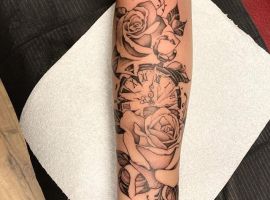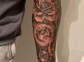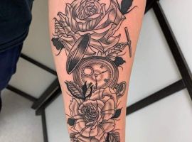 - Користується популярністю об’єднання з квітами, особливо – з трояндою, яка позначає витонченість, життя, пристрасть. Символізм ескізу тату виражається в нетривалості життя рослини, нагадування про швидкий плин часу. Інше позначення татуювання з трояндою – вічна любов.