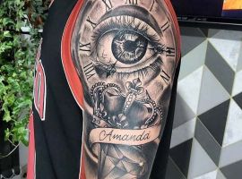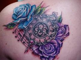 Малюнок татуювання годинник, остов якого оснащений коштовностями, передбачає, що господар зображення знаходиться в пошуку себе, свого життєвого шляху. Зображення вежі Біг Бена говорить про пунктуальність власника.