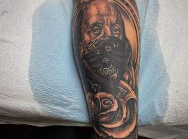 Людина з релігійними татуюваннями повідомляє, що повністю довіряє свою долю вищим силам. - Скелет в жіночому вбранні. Лик богині смерті часто наносять на плече або передпліччя. Це божество уособлює загробний світ і здатне виконувати бажання.