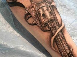 - Револьвер. Ескіз означає перевагу володаря над іншими. Це тату підходить сміливим, рішучим людям з лідерськими амбіціями.
