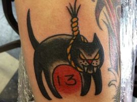 Чоловіки, з гумором відносяться до прикмет, комбінують в татуюванні відразу кілька вісників поганих подій: число тринадцать, чорне кошеня, ворона, сову. Зневажлива позиція багато говорить про характер власника татуювання – це тверезомисляча і розумна людина, яка знайде вихід з будь-якої ситуації, з оптимізмом ставиться до всього, що відбувається. Такі люди не втрачають настрій від випадкових неприємностей, знаходять раціональне пояснення навіть для «чорних смуг». Цікаво виглядають татуювання, в яких поєднані протилежні за змістом символи: підкова з числом 13, або знаменита чотирилиста конюшина.